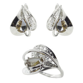 Воздушный комплект со вставкой из султанита и родированной фурнитурой. Размер камня в серьге и кольце 7х10мм. Размер серьги 19х23мм. Размер кольца 17,5х18,5мм. Комплект находится на удаленном складе (отгрузка на 2 дня позже).