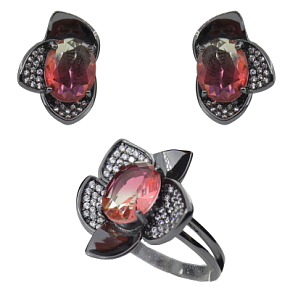 Нежный комплект в виде цветка с фианитом "турмалин" красно-желтого цвета. Размер камня в серьге: 8х11мм, размер серьги с застежкой: 18мм. Размер камня в кольце: 8х10мм. Размера кольца 19х20мм