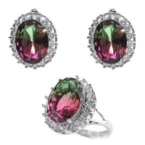 Удивительный комплект с крупным фианитом "турмалин" красно - зеленого цвета. Размер камня в серьге: 12х16мм, размер серьги с застежкой: 21мм. Размер камня в кольце: 12х16мм.
