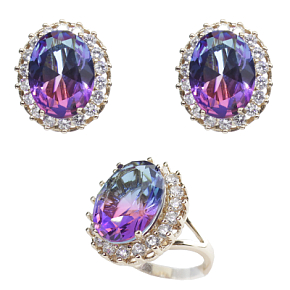 Удивительный комплект с крупным фианитом "турмалин" фиолетово - голубого цвета. Размер камня в серьге: 12х16мм, размер серьги с застежкой: 21мм. Размер камня в кольце: 12х16мм.